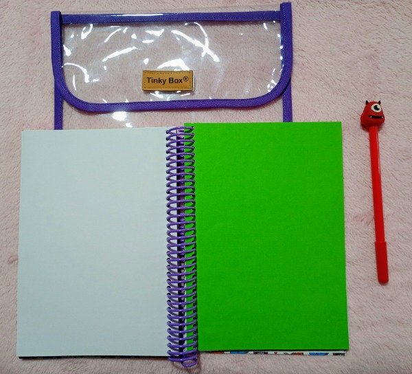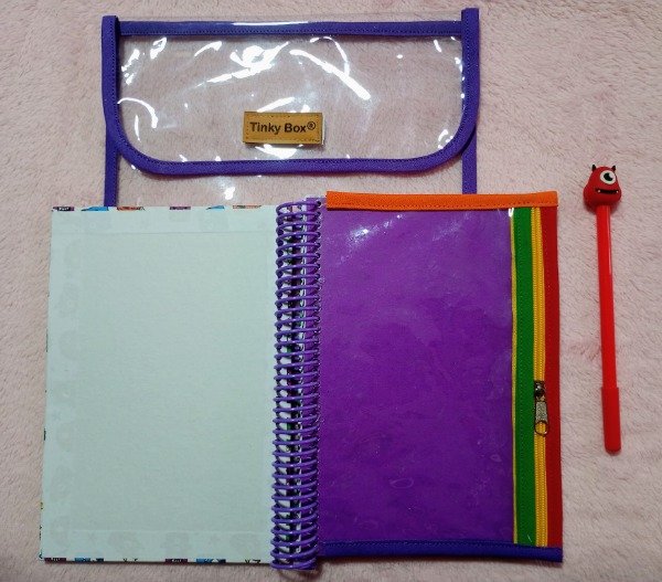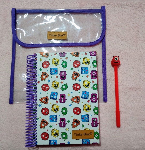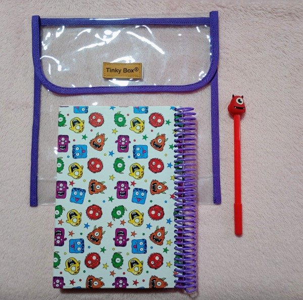 Cuaderno 80 hojas lisas con sobre cristal con cierre, división cada 40 hojas, lapicera y estuche cristal con abrojo